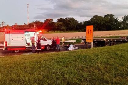 Motorista reduziu a velocidade ao notar um problema mecânico na carreta. Moto bateu na traseira do veículo. Acidente foi na altura de Araraquara (SP)....