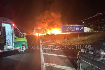 Fogo começou após choque frontal entre carreta e caminhão. Acidente aconteceu na Rodovia Washington Luís (SP-310), na altura de Itabé, na noite de terça (31/03)....